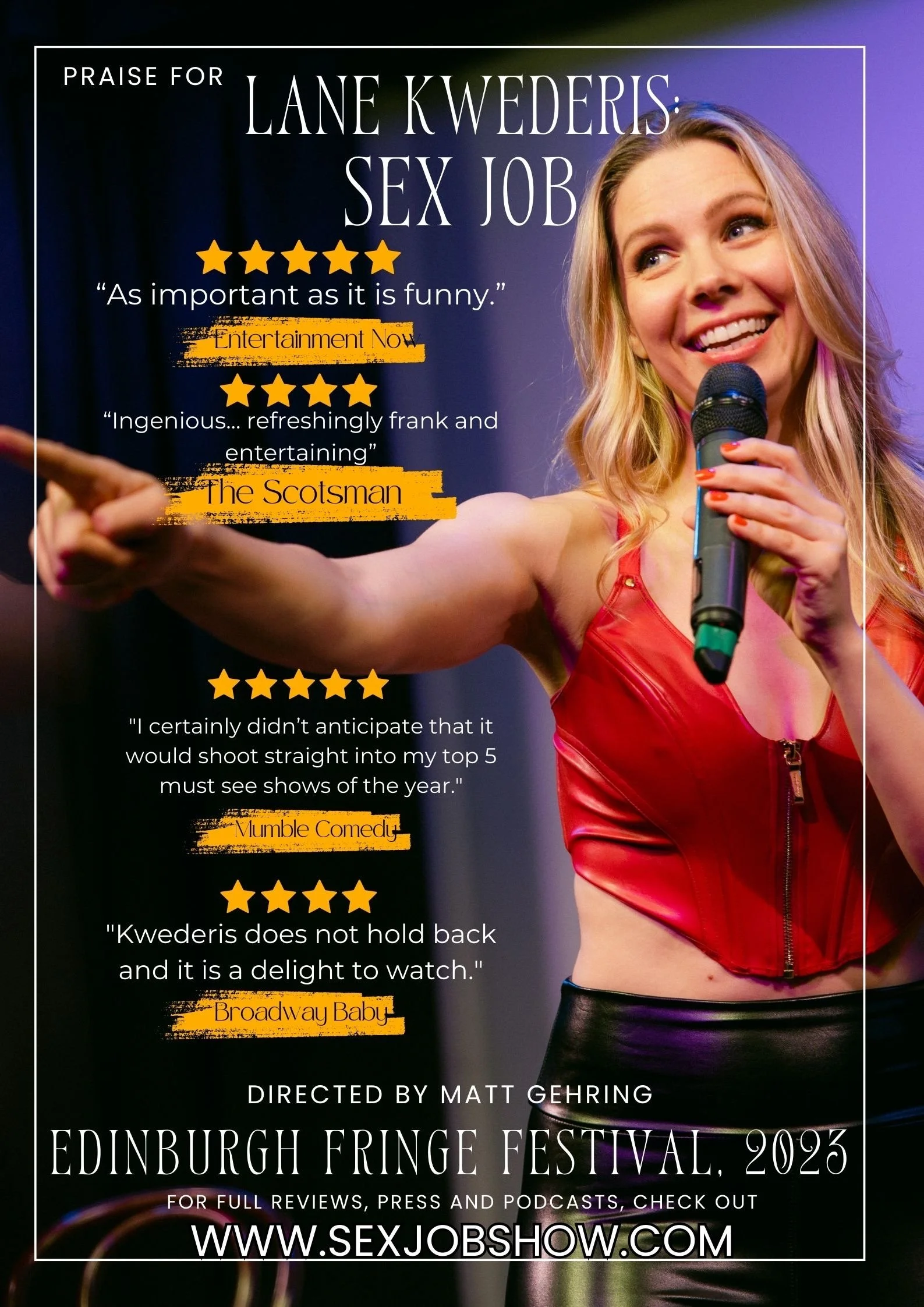 After a sold-out run in the Edinburgh Fringe Festival and receiving rave reviews (5 stars from Entertainment Now & Mumble Comedy, 4 stars from The Scotsman & Broadway Baby). Lane Kwederis is back with Sex Job the Musical: A musical comedy show about her real day job as a financial dominatrix. Get an inside look into the life of a financial dominatrix. How does it work? What even is financial domination!? Learn the ins and outs of what it’s like to be a sex worker: the good, the bad, and the shockingly hilarious!